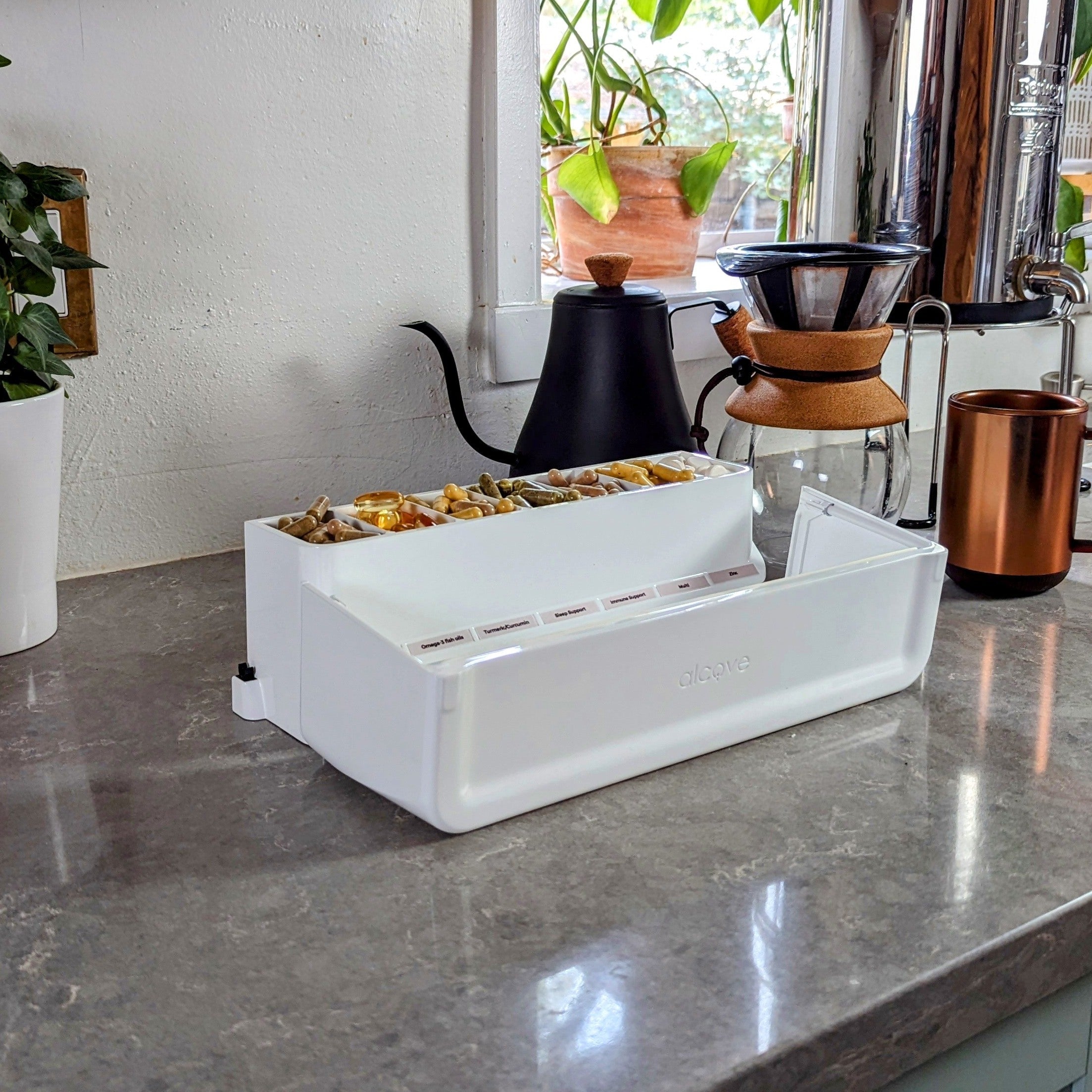 Alcove is the only modern pill box that beautifully & discreetly organizes and dispenses a month's supply of your supplements, saving you time and space.